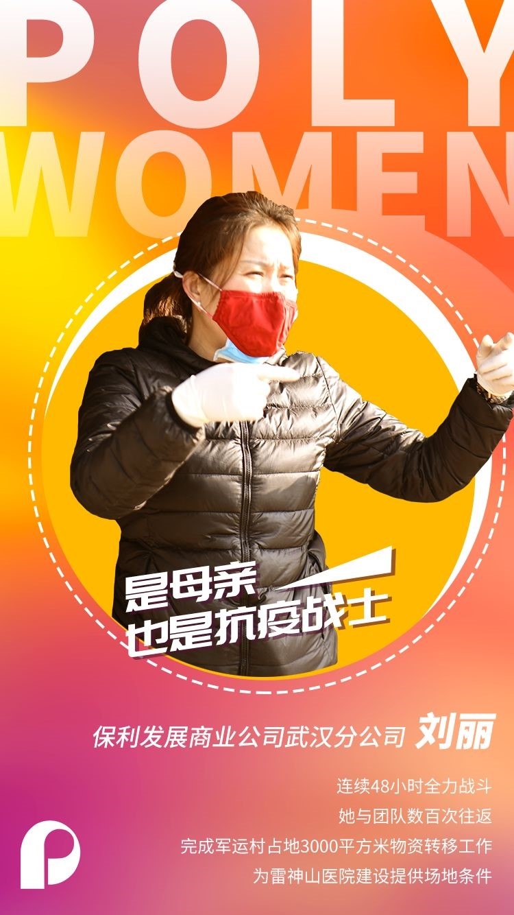 Liu Li, working in Wuhan’s company subordinated to Poly Real Estate Group Co., Ltd., fought continuously for 48 hours. She shuttled back and forth hundreds of times with her team to transfer materials covering 3,000 square meters in the Military Games Village in order to provide sufficient site for the construction of the Leishenshan (Thunder God Mountain) Hospital in Wuhan.